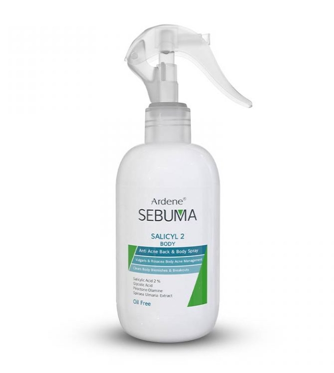 اسپری ضد جوش بدن سبوما آردن دارای پیروکتون اولامین و عصاره جای سبز بوده و موجب تنظیم ترشح چربی و رفع سبوم اضافی پوست میشود. به علاوه این اسپری توسط اسید سالیسیلیک و اسید گلیکولیک لایه برداری قوی و تخریب لایه شاخی و فرسوده پوست را باعث میشود.