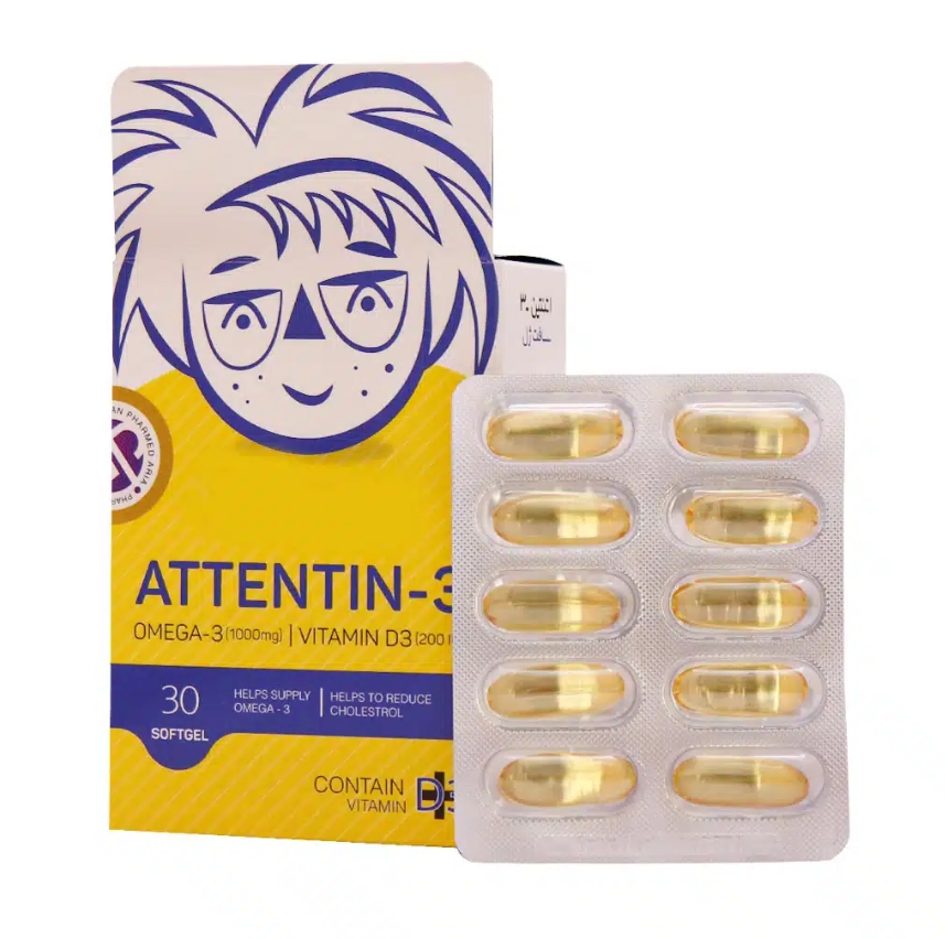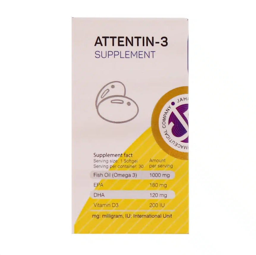 سافت ژل اتنتین 3 جهان فارمد آریا یک مکمل تغذیهای جهت کمک به سلامت سیستم قلب و عروقی، افزایش تمرکز و حافظه، تقویت سیستم ایمنی و حفظ سلامت چشم و عملکرد طبیعی سیستم بینایی است. این محصول در کنار یک رژیم غذایی مناسب به افزایش قدرت سیستم ایمنی، ترمیم زخمها، تقویت بینایی، چشایی، تقسیم طبیعی سلولها در شد و تکامل در طول دوران کودکی و نوجوانی کمک خواهد کرد. وجود ویتامین D در این فراورده به حفظ سلامتی استخوانها و دندانها کمک میکند.