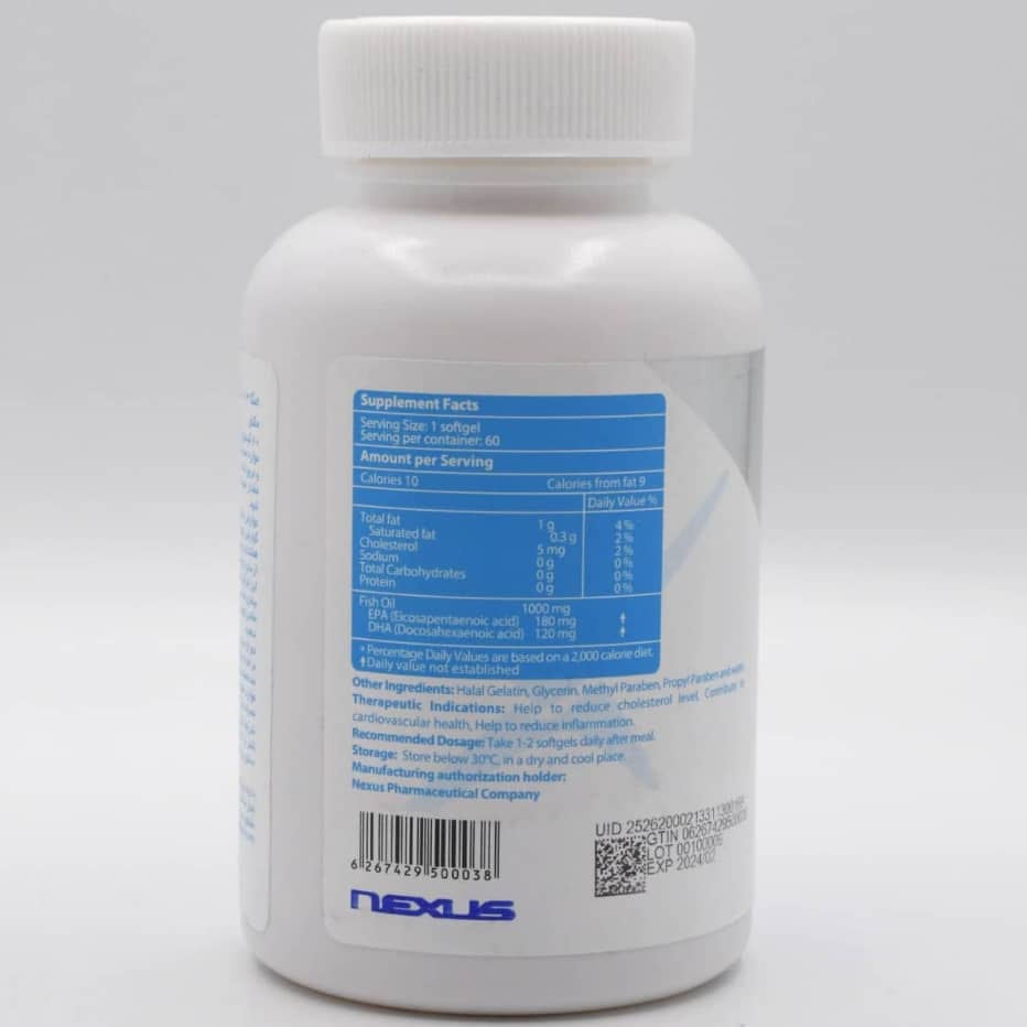 سافت ژل امگا 3 1000 میلی گرم نکستایل حاوی اسیدهای چرب ضروری بدن است که به سلامت قلب و عروق، تقویت سلامت عمومی بدن و کاهش التهاب کمک موثری میکند. همچنین این محصول در بهبود عملکرد طبیعی مغز و قدرت بینایی نیز موثر است. در هر کپسول از این مکمل، 1000 میلی گرم روغن ماهی به کار رفته است که در این میزان، 180 میلی گرم EPA و 120 میلی گرم DHA وجود دارد.