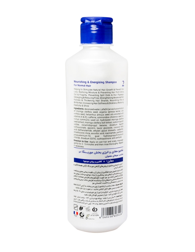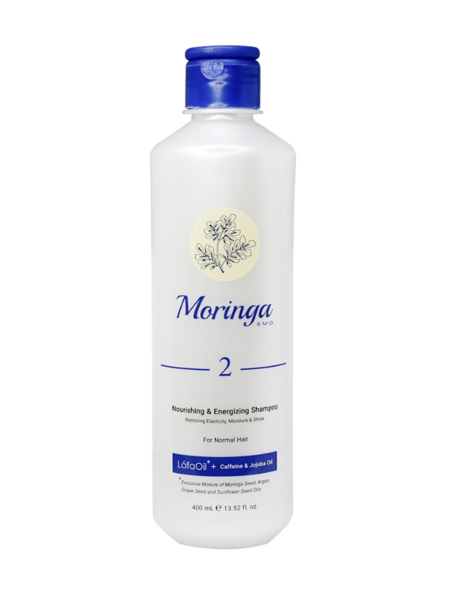 شامپو مغذی و انرژی بخش 2 مورینگا امو مناسب موهای معمولی است. این محصول علاوه بر تقویت مو، در تقویت آبرسانی، جلوگیری از ریزش و شکندگی تارها نیز تاثیر می‌گذارد. امروزه به دلیل تغذیه، شرایط آب و هوایی، عوامل ارثی، آلودگی و… ریزش مو نه تنها در آقایان بلکه در خانم‌ها نیز شایع است. استفاده از محصولات تقویت کننده مانند قرص، تونیک و شامپوهای تقویت کننده از راه‌های تقویت موی سر است که سری شامپوهای مورینگا با تنوع بسیار خوب‌شان پاسخگوی نیاز همه افراد با هر نوع پوست سر و مو هستند. این شامپو مو معمولی کافئین و روغن جوجوبا دارد که در ادامه به فواید این روغن برای پوست سر می‌پردازیم.