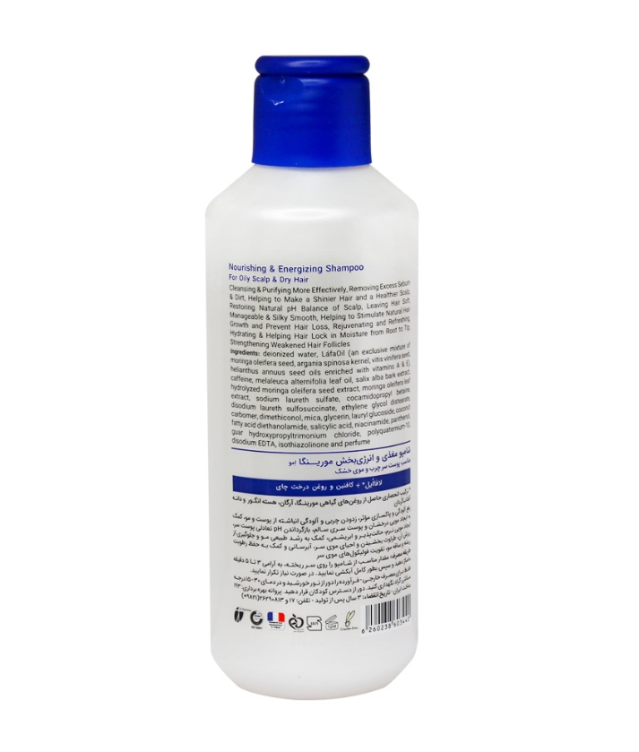 آب دیونیزه، روغن هیدرولیز شده مورینگا، عصاره برگ مورینگا، سدیم لورت سولفات، کوکامیدوپروپیل بتائین، دی سدیم لورت سولفات، گلیسیرین، لوریل گلوکزاید، اسید چرب نارگیل دی اتانول آمید، اتیلن گلیکول دی استئارات، کربومر، دایمتیکونول، ترکیب انحصاری لافا اویل ( ترکیبی انحصاری شامل روغنهای گیاهی مورینگا، آرگان، هسته انگور و دانه آفتابگردان و ویتامین A و E ) ، کافئین ، روغن درخت چای ، عصاره برگ درخت بید، میکا ، سالیسیلیک اسید ، نیاسینامید ، پانتنول ، پلی کوارتنیوم-10 ، گوار ، هیدروکسی پروپیل تری مونیوم کلراید ، دی سدیم ا.دت.آ ، ایزوتیازولینون و عطر