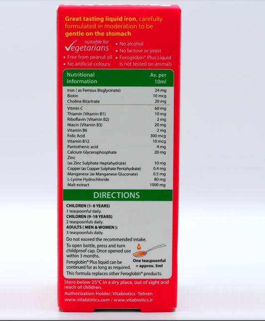 شربت فروگلوبین پلاس ویتابیوتیکس فرم پیشرفته آهن با بیشترین کارایی (فروس بیسگلیسینات)، حاوی ویتامینهای گروه B برای انتشار انرژی، حاوی بیوتین برای سلامت پوست، مو و ناخن و همچنین دارای بالاترین سطح ویتامین B9 و B12 برای متابولیسم بهتر است. استفاده از این شربت به ساخت سلولهای خونی و پیشگیری از ابتلا به کم خونی کمک میکند و همچنین سبب افزایش انرژی و کاهش خستگی میشود. فروگلوبین پلاس برای افراد در تمامی سنین مناسب است و فاقد الکل، لاکتوز، مخمر و رنگ مصنوعی است و برای افراد حساس به قند شیر و گیاهخوار نیز قابل استفاده است. این محصول دارای عصاره مالت جهت جلوگیری از ایجاد یبوست است.