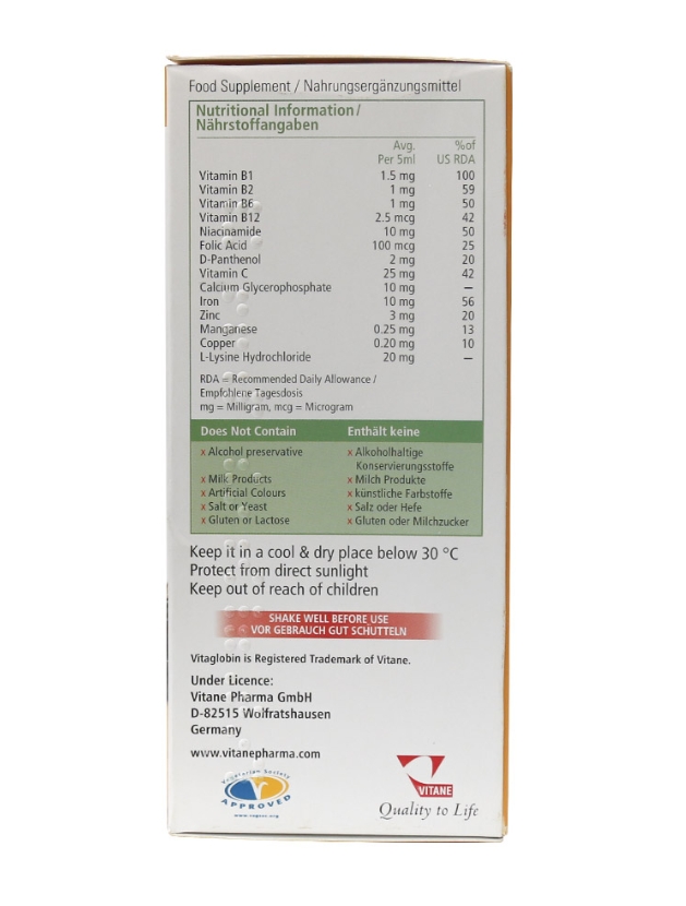 شربت ویتاگلوبین ویتان یک محلول خوراکی و مکمل غذایی مقوی جهت تولید هموگلوبین و خون سازی در بدن می باشد. فرمولاسیون دقیق و جامع آن باعث گردیده تا علاوه بر خون سازی و جبران کمبود آهن در افراد نیازمند به آهن، در رشد جسمی و ذهنی، افزایش اشتها، رفع سوء تغذیه در کودکان، جبران خون از دست رفته در زمان قاعدگی زنان، تامین مواد مغذی مورد نیاز جنین و حفظ و افزایش سلامتی و شادابی افراد در همه سنین نیز نقش موثری داشته باشد. شربت ویتا گلوبین ویتان با دارا بودن فرمولاسیون ویژه جهت بالاترین میزان جذب اهن و جبران کمبود آهن در کودکان و بزرگسالان می باشد. این مکمل به عنوان یکی ازمنابع تامین ویتامین B شناخته شده و توانسته ویتامین ها و مینرال ها مورد نیاز جهت تقویت سیستم ایمنی، تقویت سیستم عصبی، پیشگیری از کم خونی، بهبود روند تغذیه و متابولیسم بدن کمک شایانی می کند.