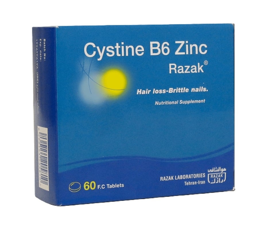 سیستئین ب 6 رازک ( Razak Cystin B6 Zink ) مکملی است که نیاز بدن به زینک، ال لیستین،اسید آمینه آرژنین و ویتامین B6 را برطرف میکند. نتیجه آن جلوگیری از ریزش مو، درمان شکنندگی ناخنها و کمک به رویش مو و ناخن است. جالب است بدانید که تمام این ترکیبات جزء ترکیبات ضروری هستند؛ یعنی بدن قادر به تولید آنها نیست یا در مقادیر بسیار کم و تنها در موارد خاص تولید میشوند. به عنوان مثال بدن ما در طور روز به 1400 میلیگرم سیستین نیاز دارد که بدن قادر به تولید آن نیست. بنابراین از طریق مواد غذایی (مانند گوشت، تخم مرغ و ماهی) یا مکمل غذایی حاوی این ماده ضروری مانند قرص سیستین B6 زینک رازک استفاده نمایید.
