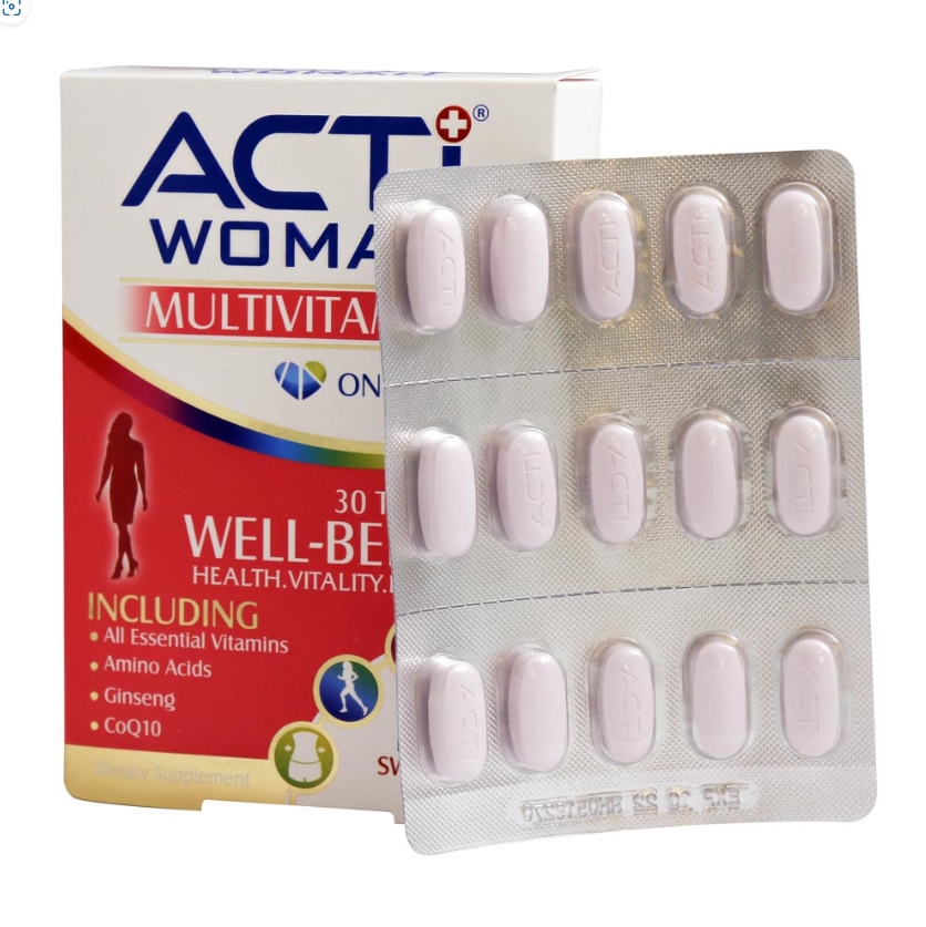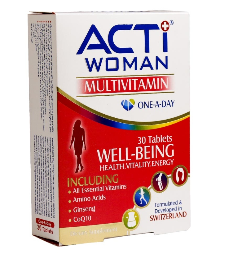 اکتی ومن یک مولتی ویتامین- مینرال است که شامل 31 ماده مغذی جهت استفاده روزانه خانمها است. این مکمل دارای تمامی ویتامینهای محلول در چربی، محلول در آب و مواد معدنی دیگر است. تمامی این ترکیبات برای استفاده روزانه جهت برآورده کردن نیازهای بدن به کار میروند. از ویژگیهای اصلی acti woman کمک به پیشگیری و کاهش علائم ناشی از سندروم پیش از قاعدگی یعنی pms بوده که در کاهش اسپاسم و تغییرات خلق و خو بسیار تاثیرگذار است. این مکمل همچنین در حفظ سلامت پوست، مو و ناخن تاثیر دارد.