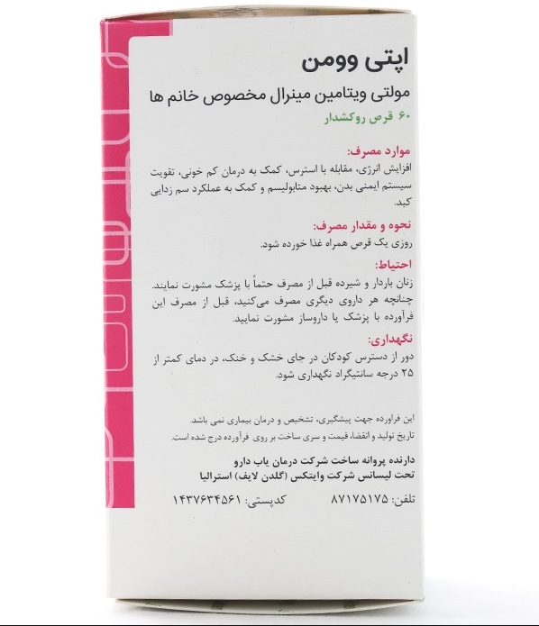 1 قرص اپتی وومن در روز همراه غذا مصرف شود.
