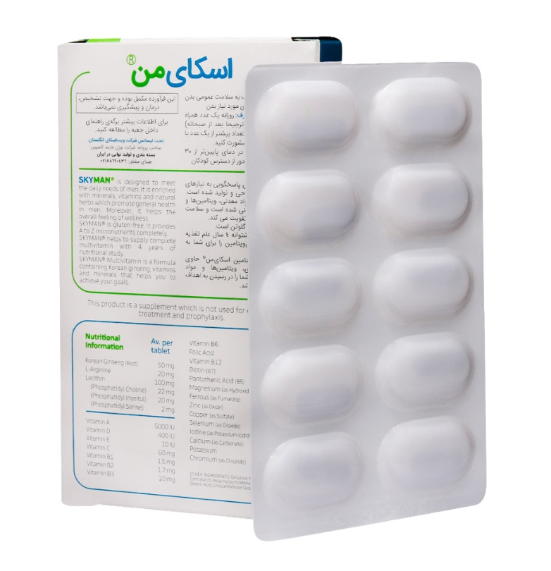 قرص اسکای من ویت اسکای با دارا بودن ویتامینها و مواد معدنی مورد نیاز آقایان، یک مکمل بسیار موثر جهت بهبود انرژی، استقامت و عملکرد جنسی شناخته شده است. این فراورده علاوه بر ویتامینها حاوی جینسینگ کرهای، ال آرژنین و لیستین نیز هست که هر یک تاثیرات بی نظیری دارند. این مکمل با کمک ترکیبات منحصر به فرد خود منجر به تقویت قوای جنسی، سلامت پروستات، افزایش متابولیسم پایه و قدرت عضلانی میشود. البته ناگفته نماند قرص اسکای من با تامین ویتامینهای مورد نیاز بدن تقویت کننده سیستم ایمنی نیز هست.