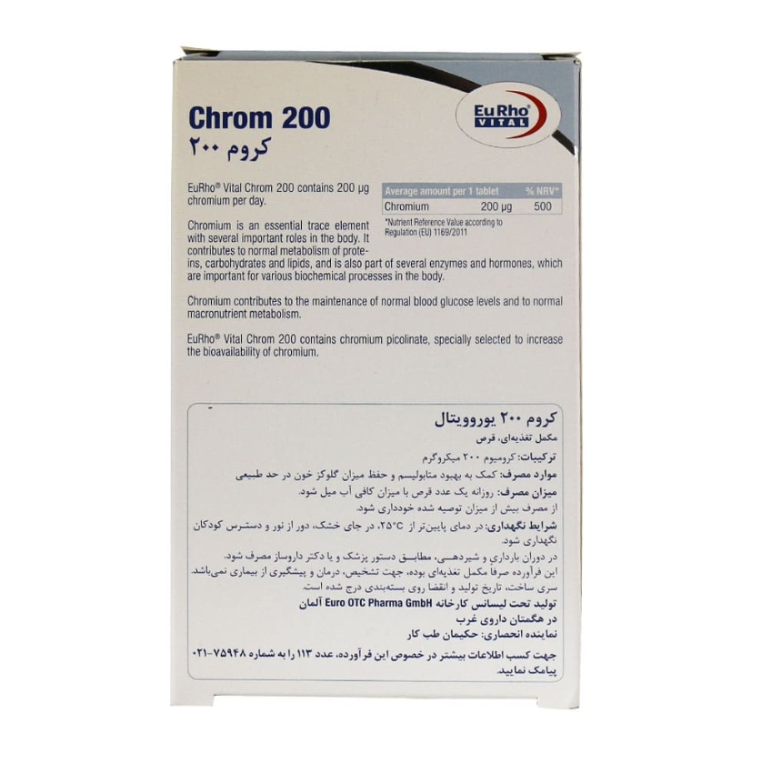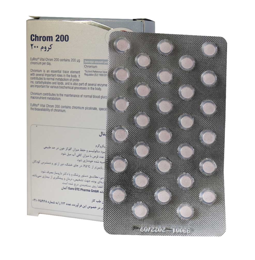 قرص کروم 200 یوروویتال مکمل تغذیهای است که توسط شرکت هگمتان داروی غرب در ایران و تحت لیسانس شرکت یورو او تی سی آلمان فرموله و تولید میشود. هر قرص این مکمل حاوی 200 میکروگرم کروم است که یک ماده معدنی ضروری برای بدن به شمار میآید ولی در غذاها به مقدار ناچیزی یافت میشود. به همین خاطر افرادی که با مشکلاتی مانند دیابت، اضافه وزن یا متابولیسم کند مواجه هستند، نیاز به خرید قرص کروم و استفاده از آن دارند. البته در نظر داشته باشید جهت اثرگذاری بیشتر میتوانید در کنار این محصول، اقدام به خرید قرص ویتامین B3 و مصرف آن نمایید.
