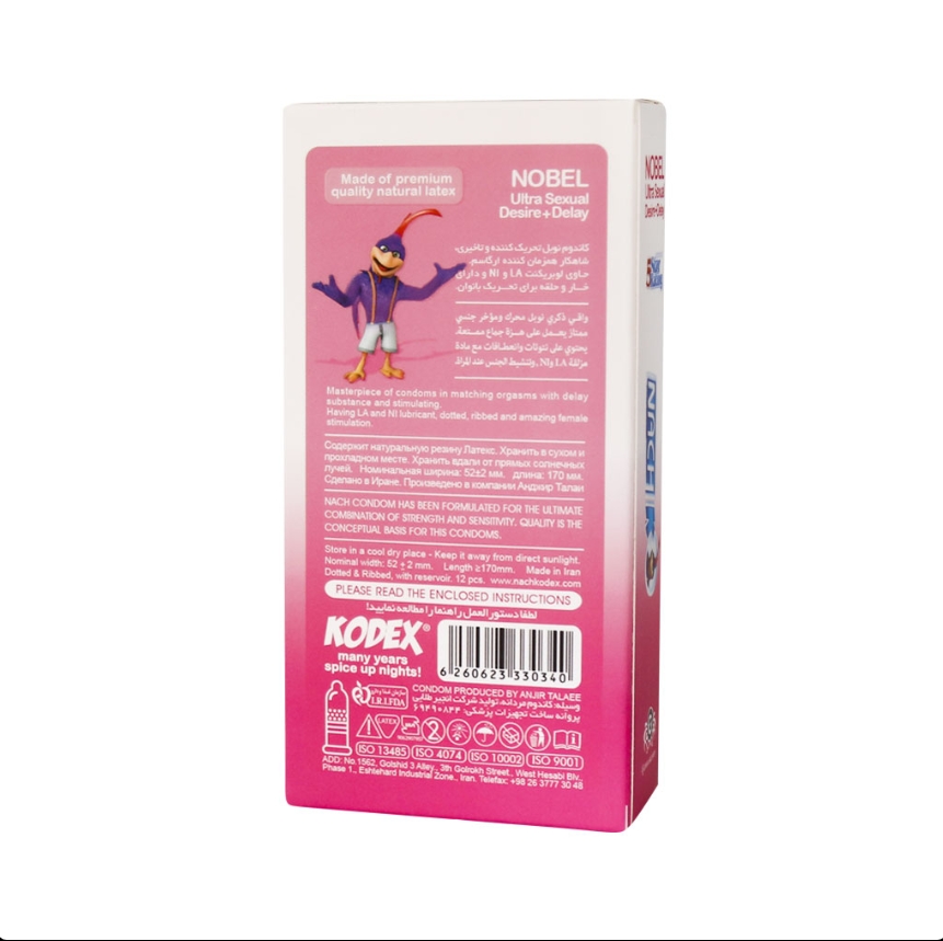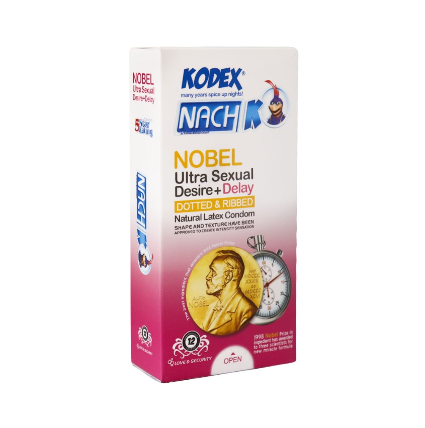 کاندوم تاخیری نوبل کدکس با طراحی فوق‌العاده هوشمندی که دارد تحریک بسیار زیادی را به واژن القا می‌کند. این محصول شاهکاری در امر هماهنگی روابط جنسی است. کاندوم نوبل با مواد تاخیری موثر از انزال زودرس جلوگیری نموده و همزمان بودن ارگاسم زن و مرد را فراهم می‌کند. این محصول برای کسانی توصیه می‌شود که برایشان لذت دو طرفه مهم بوده و به عبارتی کیفیت رابطه برایشان مهم است.