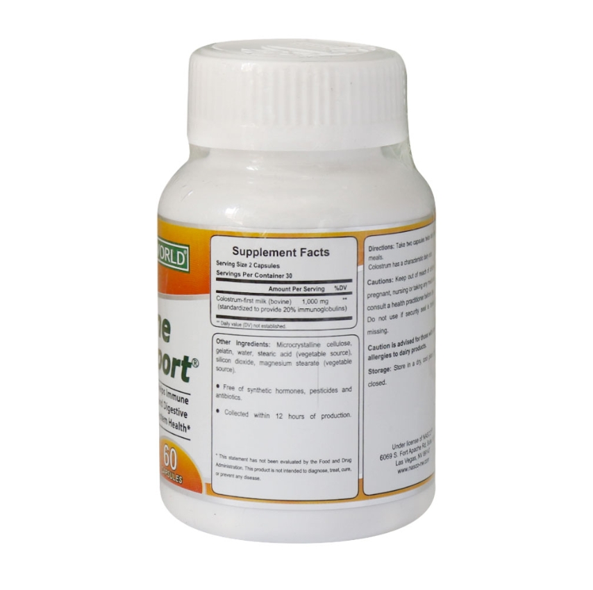 کپسول ایمیون ساپورت نچرال ورلد دارای کلستروم یا آغوز گاوی است که سبب تقویت سیستم ایمنی فرد می شود. آغوز همان شیری است که ابتدای تولد نوزاد در سینه مادر تولید میشود که تامین خوراک و تقویت سیستم ایمنی نوزاد را بر عهده دارد. این شیر حاوی پروتئینهای لاکتوفرین، مواد معدنی، آنزیمها، ویتامینها و فاکتورهای مهم رشد است که نهایتا سیستم ایمنی را ارتقا بخشیده و تحریک کننده رشد سلول، تجدید کننده قوا و ارتقا سلامتی است. فاکتورهای رشد و ایمنی در آغوز گاو نیز همانند ساختارهای مولکولی در آغوز انسان است. کلستروم گاوی لاکتوفرین و آنتی بادیها که برای مقابله با باکتری و ویروسها استفاده میشود را دارا است. این آنتی بادیها شامل ایمونوگلوبینهای M، A و G بوده که همگی توسط بدن مصرف میشوند و حیاتی محسوب میشوند.