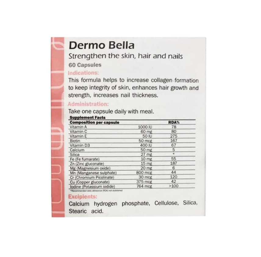از مهمترین عناصر کمیاب مورد نیاز طیف وسیعی از فرآیندهای بیولوژیک بدن به ویژه تولید گلبولهای قرمز و سنتز کلاژن (پروتئین اصلی ساختار پوست) است. محصول درموبلا با تامین 50 درصد آهن مورد نیاز روزانه به شکل ملح فومارات که دارای جذب بالا و فاقد عوارض گوارشی است، موجب حفظ سلامت و یکپارچگی ساختار پوست، مو و ناخنها میشود. ریزش مو، خشکی پوست و شکنندگی ناخنها از مهمترین علایم کمبود آهن میباشد.