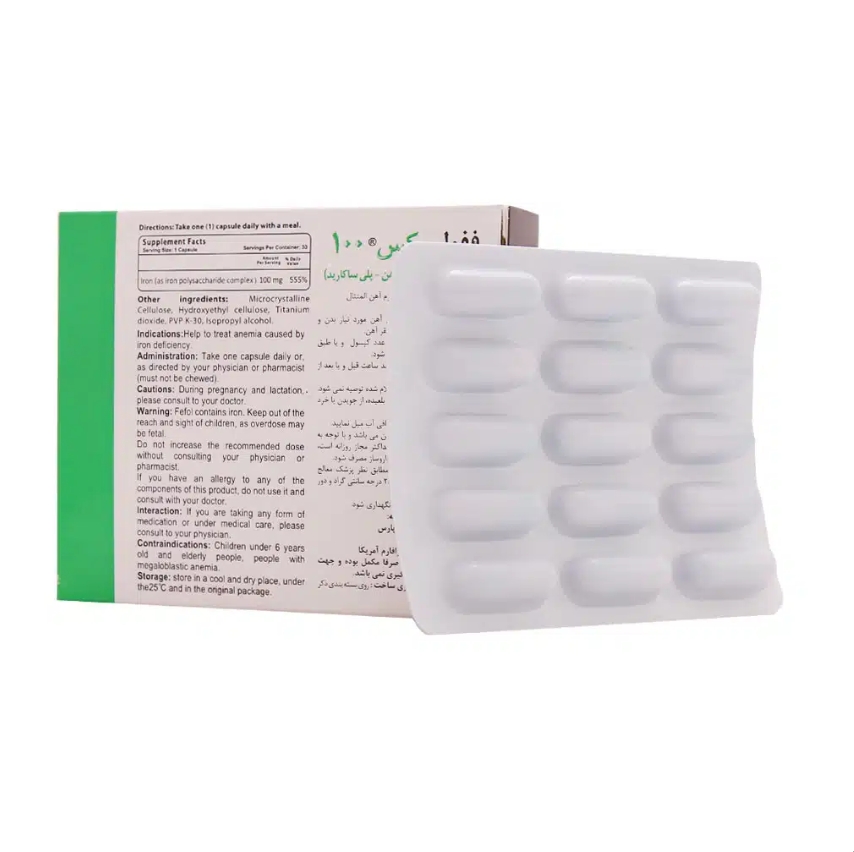 در کپسول fefol max 100 از پلی ساکارید آهن استفاده شده است. پلی ساکارید کمپلکس آهن به عنوان یک راهکار موثر جهت پیشگیری و درمان کمبود آهن شدید و کم خونی ناشی از فقر آهن مورد استفاده قرار میگیرد. همانطور که میدانید آهن به عنوان یک عنصر مهم جهت انجام عملکردهای گوناگون در بدن، به ویژه انتقال اکسیژن در خون از اهمیت ویژهای برخوردار است. در نظر داشته باشید علت آنمی یا همان کم خونی هر چه باشد، فقر آهن میتواند به علائم ناخوشایندی منجر شود که بر کیفیت زندگی تاثیر میگذارد. ریزش مو، کاهش تمرکز و خستگی چند نمونه از این مشکلات است. به همین خاطر اگر فکر میکنید کم خونی و فقر آهن دارید، بلافاصله با پزشک متخصص مشورت نموده و در صورت صلاح دید اقدام به خرید کپسول ففول مکس 100 و استفاده از آن نمایید.