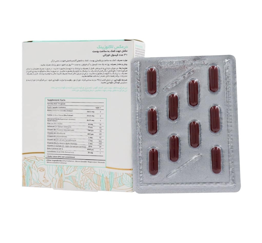 کپسول لاکتوزینک درمکس با داشتن ترکیبات گیاهی و ویتامینهای مورد نیاز بدن به سلامت و پاکسازی پوست کمک میکند. همچنین لاکتوزینک در بهبود التهابات ناشی از آکنه، تاثیر بسزایی دارد. لاکتو زینک را میتوان بهترین مولتی ویتامین برای پوست دانست، چرا که دارای ریزمغذیهایی بوده که باعث ساخت کلاژن و افزایش استحکام پوست و حفاظت از سلولهای پوست، مو و ناخن میشوند. مزیت اصلی لاکتوزینک درمکس به عنوان قرص برای تقویت پوست و مو این است که این قرص توسط جریان خون، مواد مغذی را به عمیق ترین قسمتهای پوست هدایت میکند.