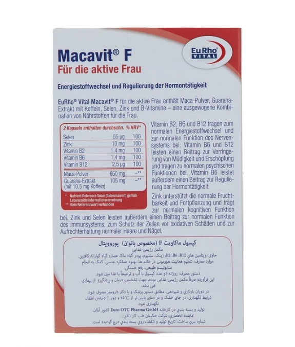کپسول ماکاویت اف یوروویتال با بهره گیری از ترکیبات منحصر به فرد شامل عصاره گیاهان ماکا، گوارانا به همراه ویتامین های گروه B و عناصر معدنی همچون زینک و سلنیوم به صورت اختصاصی برای افزایش انرژی و تنظیم فعالیت هورمونی بانوان طراحی شده است. قرص ماکاویت اف بانوان یورو ویتال در کاهش علائم یائسگی مانند گرگرفتگی و بهبود خلق و خو در زنان موثر عمل می کند. این فرآورده تحت لیسانس کارخانه آلمانی یورو او تی سی فارما در کمپانی هگمتان داروی غرب تولید میشود. قابل ذکر است، این محصول به فرم کپسول بوده ولی اکثر مردم با نام قرص ماکاویت بانوان میشناسند؛ به همین دلیل ما در متن از قرص ماکاویت استفاده میکنیم.